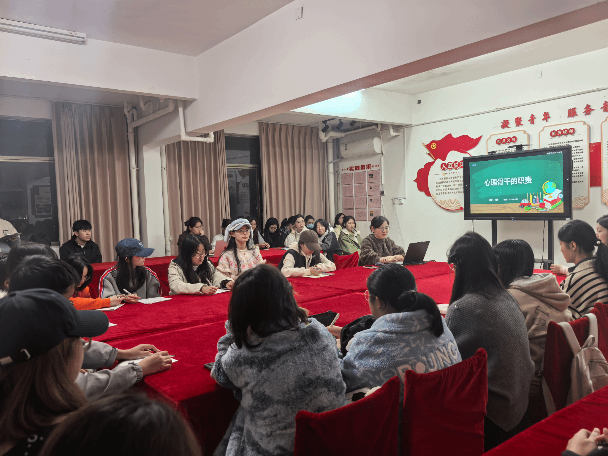 会议伊始,刘珍老师围绕“心理健康知识概述”“心理骨干角色定位与核心职责”“重点关注群体识别”“心理问题干预与报告流程”四大模块展开系统讲解。她强调,心理骨干是班级心理健康工作的“传声员”“排雷兵”,更是同学们的“支持者”“陪伴者”,需全面具备心理危机识别、及时上报、隐私保护、协助开展心理健康教育等专业能力,切实发挥桥梁纽带作用。