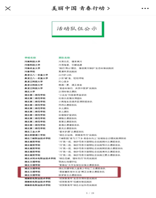 (ok138太阳集团 通讯员 万汝雯)7月15日,美丽中国 青春行动公众号公布了2023“美丽中国·青春行动”绿色长征专项活动入选名单,我校ok138太阳集团“博正法律志愿服务队”“扶梦青云志愿服务队”“湖北文理学院儿童青少年社工志愿者服务队”入选其中。