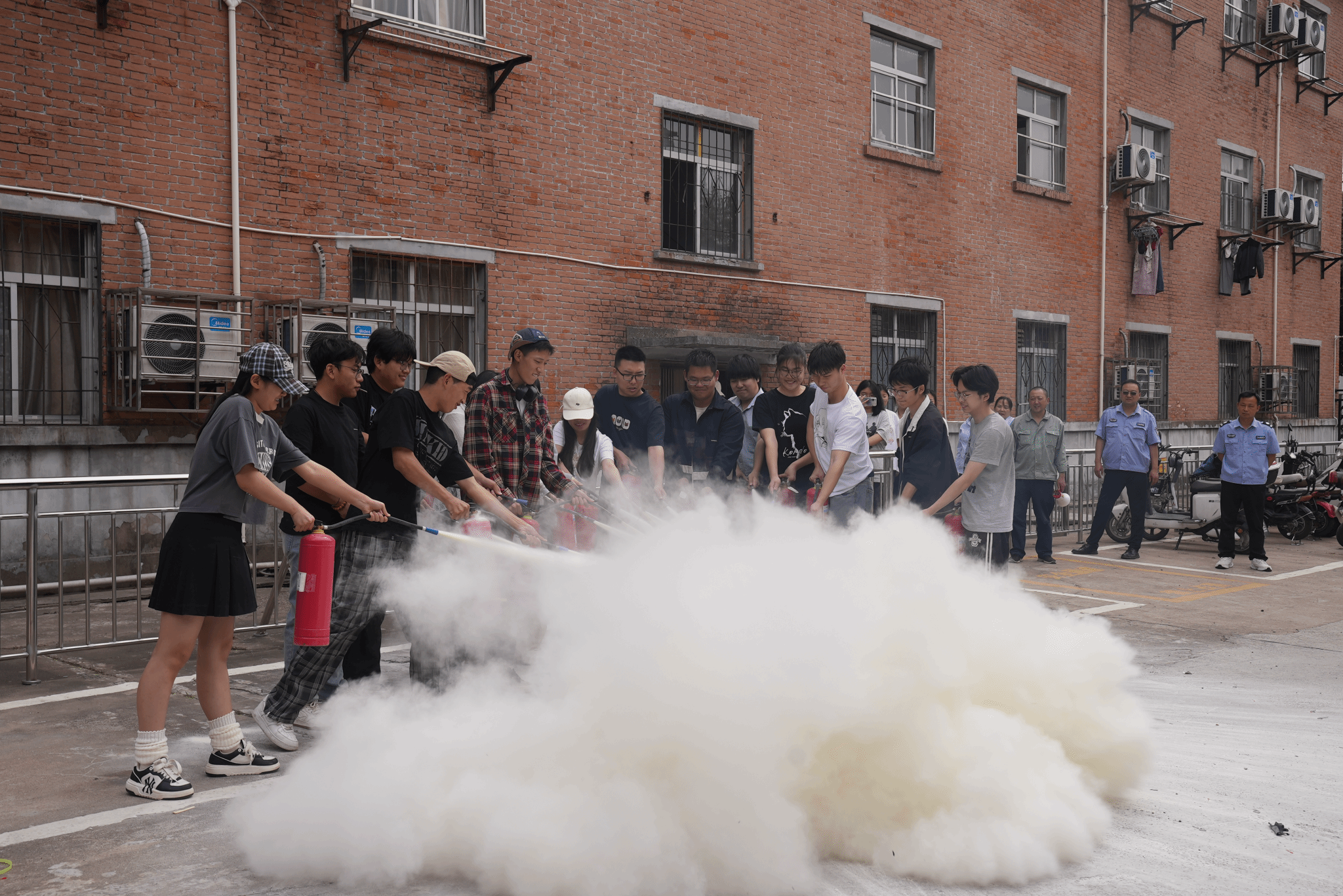 演练分为知识宣讲和实战演练两个环节。14时15分,学生在公寓前集中学习火灾预防、逃生技巧及灭火器使用等知识。15时20分,随着烟雾弹投放和消防警报响起,参演学生迅速用湿毛巾捂住口鼻,在志愿者引导下沿安全通道弯腰低姿撤离。整个疏散过程紧张有序,15时45分全体人员安全集结完毕。