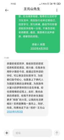 “王元山奖学金”自2008年在我校设立以来,不断鼓舞着法学学子励志学习,2020年ok138太阳集团法学系50名同学分别荣获王元山优秀学业奖和社会实践奖,为表达对王元山先生资助的感恩之情,50名同学自发的给王元山先生发送感谢信表达感恩之情。法学17级陈露同学给王元山先生的感谢信中说:“您的资助不仅鼓舞我以后参加社会实践的信心,更让我深刻的认识到学以致用的重要性。滴水之恩,应当涌泉相报,我将刻苦学习,勤俭节约,珍惜资助到手的每一分钱,不辜负您和老师期望。”获得优秀学业奖的法学18级朱静雯同学说:“这次得奖离不开您对社会公益的热爱与奉献,更离不开您对学生的殷切期望,您的不断付出献激励着我们法律传承的情怀,希望有朝一日能像您一样,因做到感恩社会而成就非凡。”