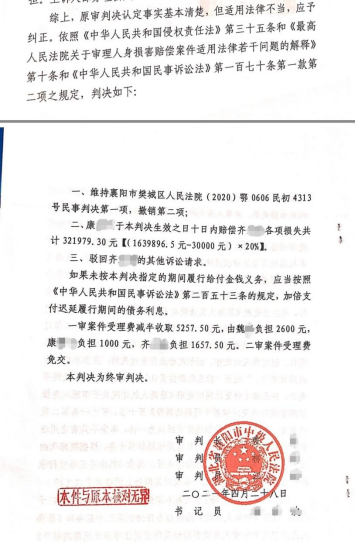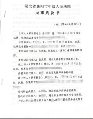 (学生通讯员 姜晨露)2021年5月7日,湖北文理学院第八届法律诊所学员何宇阳和第九届法律诊所学员姜晨露参与代理的齐某诉魏某、康某提供劳务者受害责任纠纷法律援助案件,襄阳中院终审判决支持当事人齐某除已领取的医疗费外,残疾赔偿金及暂判五年的护理费等赔偿款共计达一百万余元。该案自2019年10月指派法律援助开始至二审做出生效判决历时一年七个月,在此期间,法律诊所指导老师和学员一起始终不忘初心,克服该案案情重大、法律关系复杂、取证困难等系列困难,全心全意为当事人及其家人属提供精准优质高效法律服务,既为当事人争取到了诉讼费减免,又为当事人争取到了可能的最好判赔结果。当事人对湖北文理学院法律诊所师生提供的法律援助过程和结果相当满意,同时也对法律诊所的老师和学员表示由衷感谢。