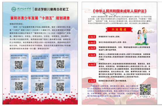 团队成员为中学生们发放襄阳市青少年发展“十四五"规划 (中学生)调查问卷和《中华人民共和国未成年人保护法》宣传各六百余份,鼓励中学生们在问卷上认真客观地反映自己内心的真实想法,问卷填写完毕,团队成员为中学生们宣讲红色经典故事,引导中学生在幸福生活的当下不忘革命先烈的伟大牺牲,树立青春理想。表演了结合社工专业知识创编“反校园暴力行为”的情景剧,将严肃的法条和自我保护的技巧融入到精彩的剧情中,倡导广大中学生树立自我维权意识,借助法律武器自我保护,中学生在欢声笑语中有所学、有所悟、有所收获!在整个活动中,中学师生们对团队的到来表示欢迎和感谢,学生的参与热情高涨。从他们的热情参与中我们既感受到了他们的青春活力,更感受到了他们对我们的期待。让我们一起为襄阳市儿童青少年健康发展努力!