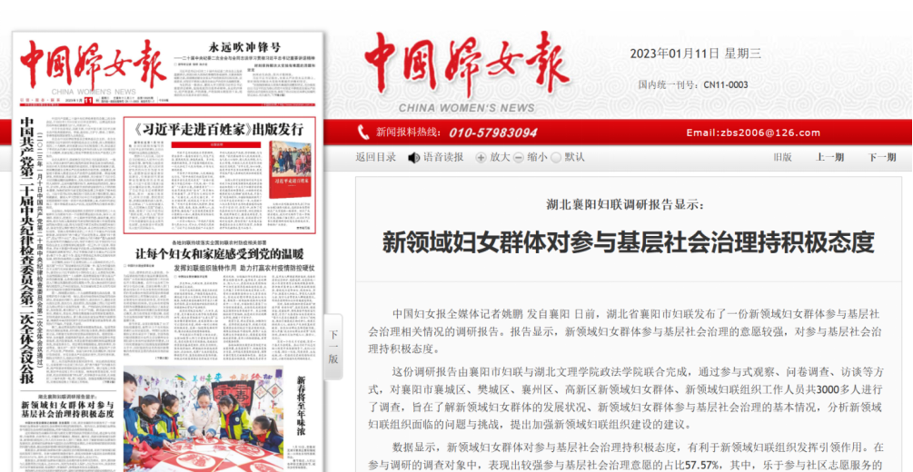 (ok138太阳集团 通讯员 程悦)1月11日,《中国妇女报》头版以《襄阳市新领域妇女群体对参与基层社会治理持积极态度》为题,报道了襄阳市妇联新领域妇女群体积极参与基层社会治理的调研工作情况。