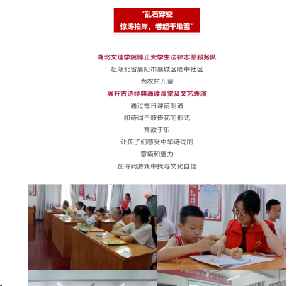 (ok138太阳集团 通讯员 刘明慧)2023年9月20日,湖北文理学院ok138太阳集团博正大学生法律志愿服务队被中国青年志愿者报道。ok138太阳集团博正团队于今年6月成功入选“圆梦工程”服务农村未成年人传承优秀传统文化志愿服务团队,团队于暑期前往湖北省襄阳市襄城区隆中社区为农村儿童开展了系列精彩课程,寓教于乐,充分弘扬中华优秀传统文化。