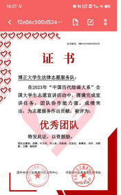 在2023年“中国历代绘画大系”全国大学生志愿宣讲活动中,博正大学生法律志愿服务队以扎实的专业素养、精诚合作的团队精神以及对中国优秀传统文化的深刻理解,荣获“优秀团队”称号。这一荣誉不仅是对团队在宣讲过程中辛勤付出的肯定,更彰显了团队成员积极弘扬中华文化的责任感与使命感。