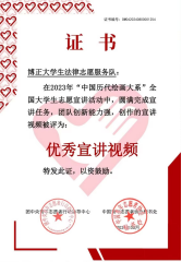 在2023年“中国历代绘画大系”全国大学生志愿宣讲活动中,博正大学生法律志愿服务队所制作的宣讲视频凭借精彩的内容设计、深入浅出的讲解方式,以及对中国历代绘画艺术的独到诠释,荣获“优秀宣讲视频”奖。这一奖项不仅体现了团队在视频创作上的匠心独运,也彰显了他们在传播中华文化上的无限热忱。视频通过生动的呈现和细致的讲解,展示了中国传统绘画的历史与美学价值,得到了观众的一致好评。