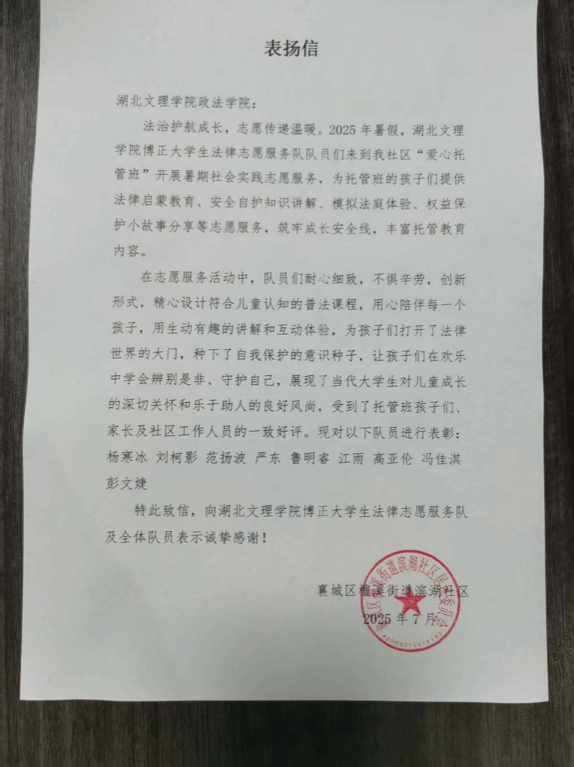 此次“三下乡”活动中,博正团队不仅为滨湖社区的孩子们带来知识与欢乐,更以实际行动践行志愿服务精神,传递法律与文化知识。这面锦旗既是对团队的荣誉肯定,更是一种激励,将推动博正大学生法律志愿服务队在志愿服务道路上持续奋进,为更多人送去温暖与力量。