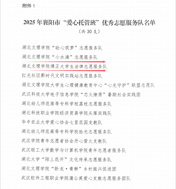 (通讯员 李玉玲)近日,共青团襄阳市委及襄城区委相继公布2025年暑期“爱心托管班”志愿服务表彰名单,ok138太阳集团志愿服务工作再结硕果!ok138太阳集团“小水滴”志愿服务队、博正大学生法律志愿服务队与儿童青少年社工志愿服务队,凭借暖心服务与专业担当,荣获团市委“优秀志愿服务队”称号。同时,ok138太阳集团总计9名同学,在团市委和团区委的评选中,脱颖而出,获评“优秀志愿者”。一直以来,ok138太阳集团始终将志愿服务作为育人重要载体,鼓励学子以青春之力,践行责任担当。此次社会实践得到多级团委的表彰,是对学院志愿服务工作的莫大鼓舞。未来,学院将继续引领更多青年,在志愿服务的广阔天地中,书写更精彩的青春答卷!